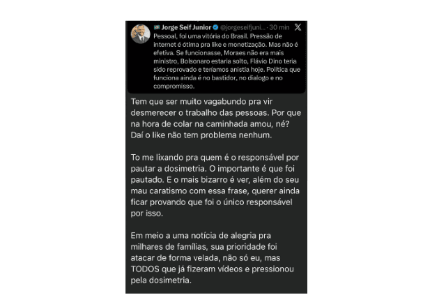 “Tem que ser muito vagabundo para vir desmerecer o trabalho das pessoas. Por que na hora de colar na caminhada amou, né? Daí o like não tem problema nenhum. Tô me lixando pra quem é o responsável por pautar a dosimetria. O importante é que foi pautado. E o mais bizarro é ver, além do seu mau caratismo com essa frase, querer ainda ficar provado que foi o único responsável por isso. Em meio a uma notícia de alegria pra milhares de famílias, sua prioridade foi atacar de forma velada não só eu, mas TODOS que já fizeram vídeos e pressionou [sic] pela dosimetria”, escreveu.