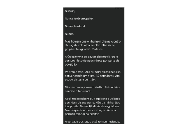 Nikolas, então, compartilhou a publicação no grupo da oposição no WhatsApp e criticou o seu colega de partido.