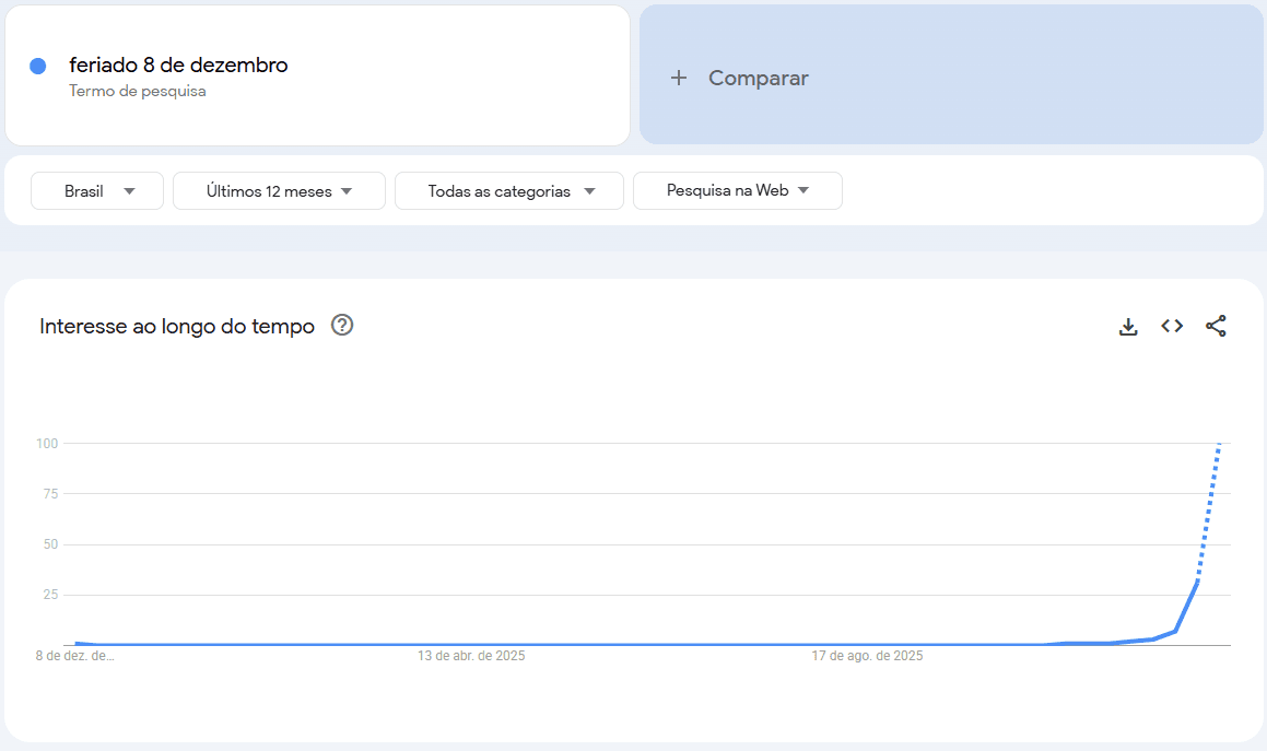 Com a chegada da data, as buscas sobre "feriado 8 de dezembro" no Google registraram aumento do interesse na comparação com os últimos 12 meses, segundo dados do Google Trends – ferramenta que exibe os termos mais populares no buscador.