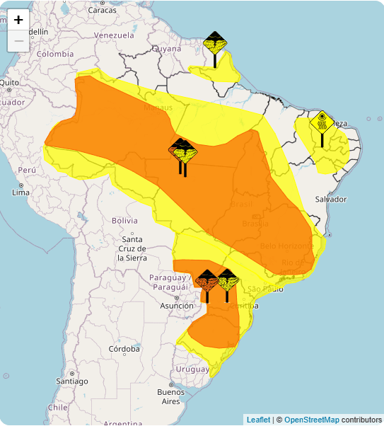O alerta laranja de tempestade, válido até as 10h de terça-feira (16), atinge os estados de Mato Grosso do Sul, Paraná, Rio Grande do Sul, Santa Catarina e São Paulo. Ventos de até 100 km/h, até 100 mm/dia de chuva e queda de granizo são esperados. Há risco de corte de energia elétrica, estragos em plantações, queda de árvores e de alagamentos. As áreas afetadas são: