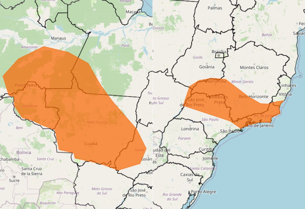 O alerta laranja de chuvas intensas, válido até as 23h59 de terça-feira (10), atinge os estados do Amazonas, Espírito Santo, Goiás, Mato Grosso, Mato Grosso do Sul, Minas Gerais, Pará, Rio de Janeiro, Rondônia e São Paulo. Ventos de até 100 km/h e até 100 mm/dia de chuva são esperados. Há risco de corte de energia elétrica, queda de árvores, alagamentos e descargas elétricas. As áreas afetadas são: