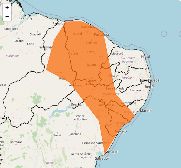 Alagoas, Bahia, Ceará, Paraíba, Pernambuco, Piauí, Rio Grande do Norte e Sergipe estão em alerta laranja para acumulado de chuva. Há risco de alagamentos, deslizamentos de encostas e transbordamentos de rios nas cidades com áreas de risco. O aviso é válido até as 23h59 de terça-feira (10) e atinge os estados nas seguintes regiões: