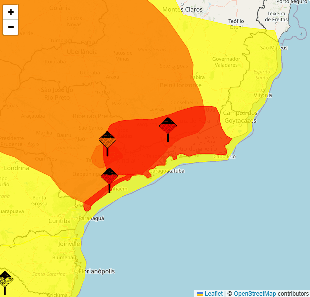 Quatro estados do Brasil estão em alerta vermelho – que significa "grande perigo" – para acumulado de chuva nesta quinta-feira (12), de acordo com o Instituto Nacional de Meteorologia, o Inmet. O aviso, que é válido até 23h59, atinge Minas Gerais, Paraná, Rio de Janeiro e São Paulo.