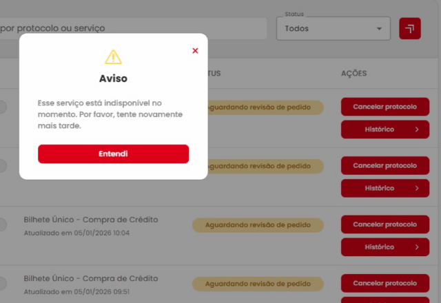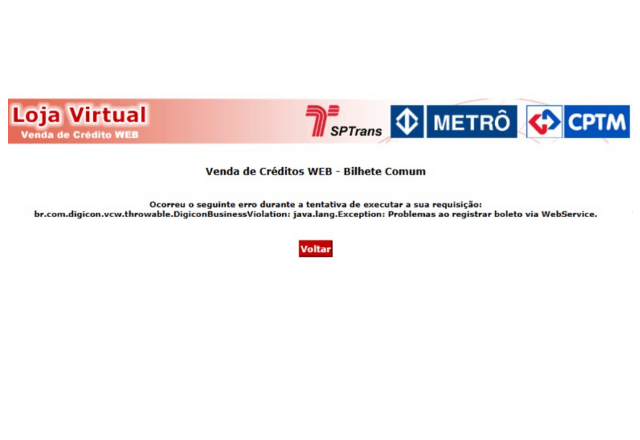 Há relatos de erro na finalização da compra de créditos, tanto no site da SPTrans (São Paulo Transporte) quanto no aplicativo. Alguns tentam realizar a aquisição dos créditos desde sábado (3), sem sucesso.