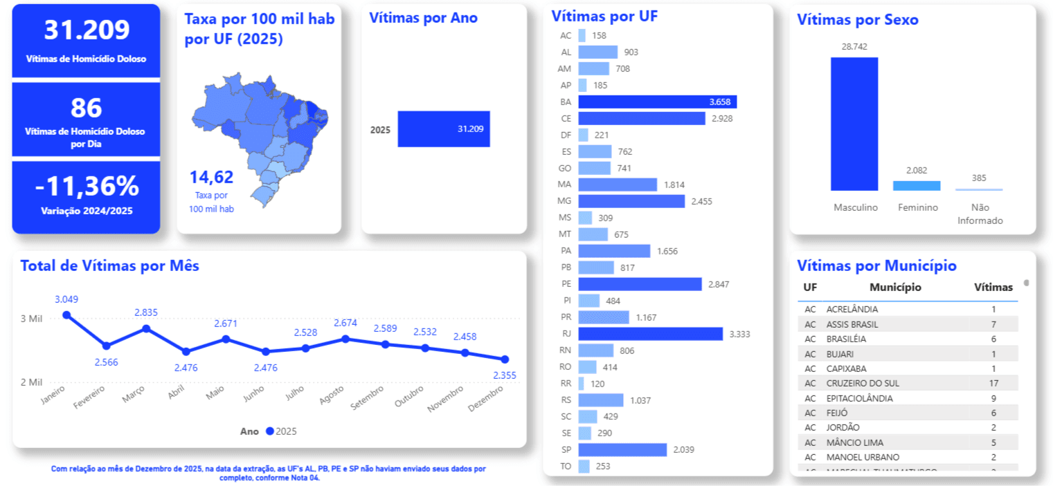 Em 2025, o país contabilizou 31.209 vítimas de homicídio doloso, média de 86 por dia, o que representa uma redução de 11,36% em relação a 2024.
