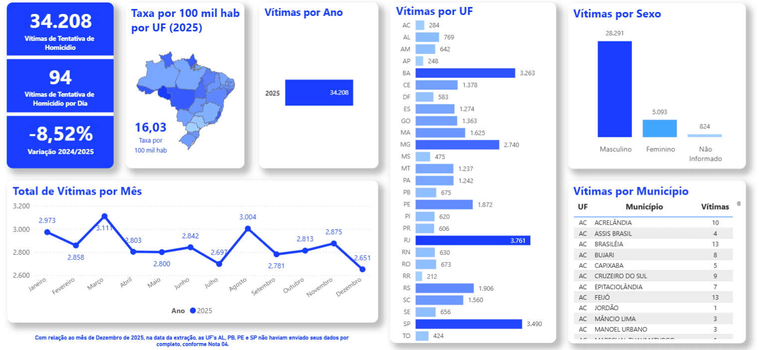 Os dados também apontam números elevados de tentativas de homicídio. Em 2025, foram 34.208 vítimas, média de 94 por dia, apesar de uma queda de 8,52% em relação ao ano anterior.