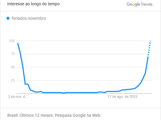 O próximo feriado nacional a cair em um dia de semana só acontece no fim de novembro, mas, apesar disso, os brasileiros já estão se questionando: tem feriado em novembro? A dúvida dos internautas brasileiros gerou um aumento de pesquisas no Google nesta segunda-feira (3), segundo dados do Google Trends, ferramenta que exibe os termos mais populares no buscador.