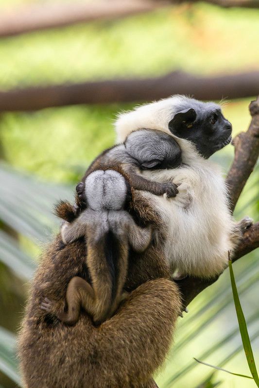 Os recém-nascidos permanecem sob os cuidados constantes do casal. Enquanto a fêmea é responsável pela amamentação, ambos os adultos se revezam no transporte dos filhotes, na higienização, na proteção e até no estímulo ao desenvolvimento. Em dias mais frios, os novos papais também expõem os pequenos ao sol, ajudando na regulação térmica.