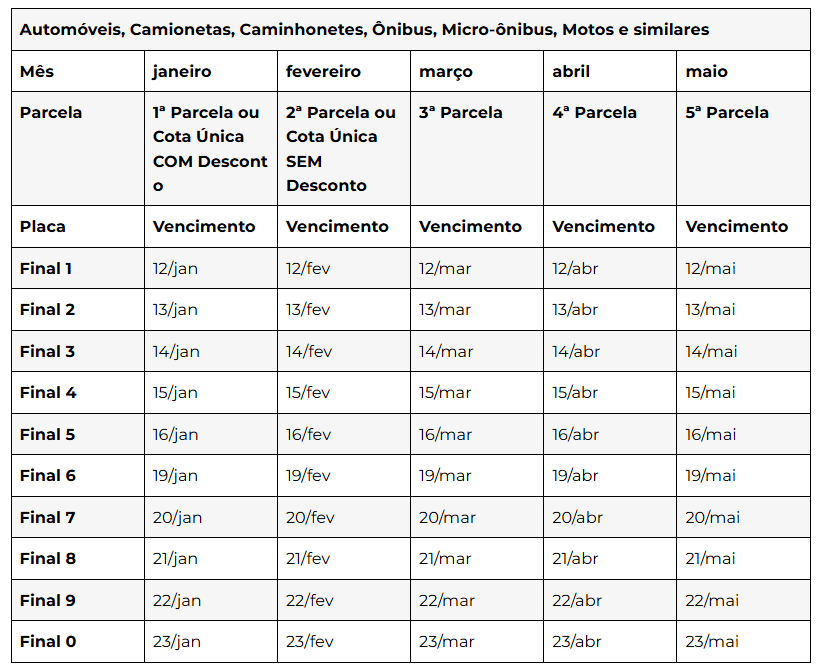 O calendário do IPVA 2026 segue até o dia 23 de abril, quando se encerra o prazo para veículos com final 0. Confira as datas a seguir.