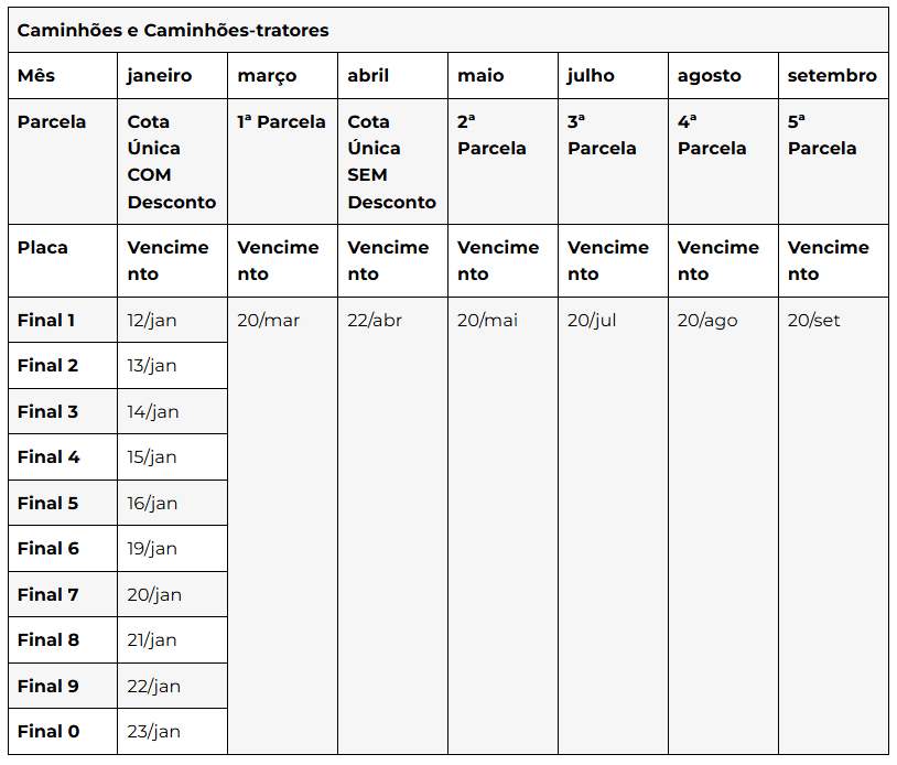 A Secretaria da Fazenda e Planejamento do Estado de São Paulo (Sefaz-SP) retomou neste mês o calendário de vencimentos do imposto. No caso dos proprietários de caminhões, independentemente do final da placa, o prazo para pagamento em cota única, sem desconto, vai até 22 de abril.