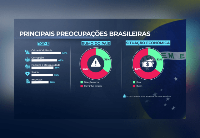 Na sequência, estão pobreza e desigualdade social (36%), e saúde (35%). Impostos fecham o grupo das cinco principais preocupações, com 28%.
