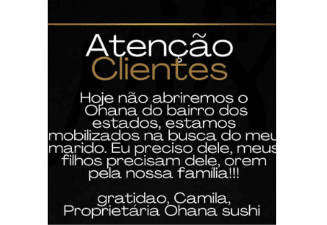 Nas redes sociais, a esposa de Jhon informou que o restaurante não abrirá nesta terça-feira (6), pois a família permanece mobilizada nas buscas. Na nota, ela reforçou que ela e os filhos precisam do marido e pediu orações e apoio à família neste momento.
