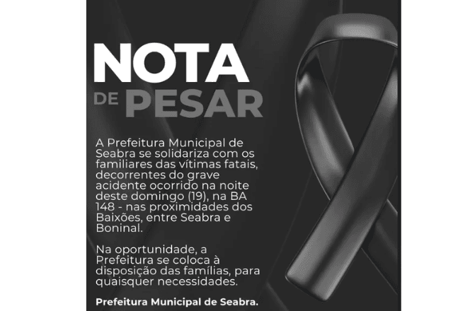 Em nota publicada nas redes sociais, a Prefeitura de Seabra lamentou as mortes e se solidarizou com os familiares das vítimas fatais: “A Prefeitura se coloca à disposição das famílias para quaisquer necessidades”.