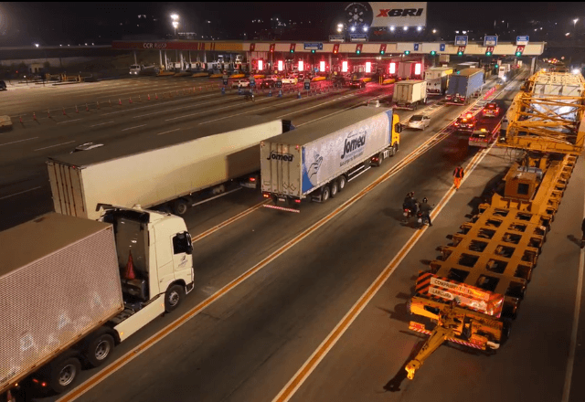 A passagem de uma supercarga de 136,07 metros de comprimento e 6,10 metros de largura pela Rodovia Presidente Dutra pôde ser vista na manhã desta segunda-feira (23).