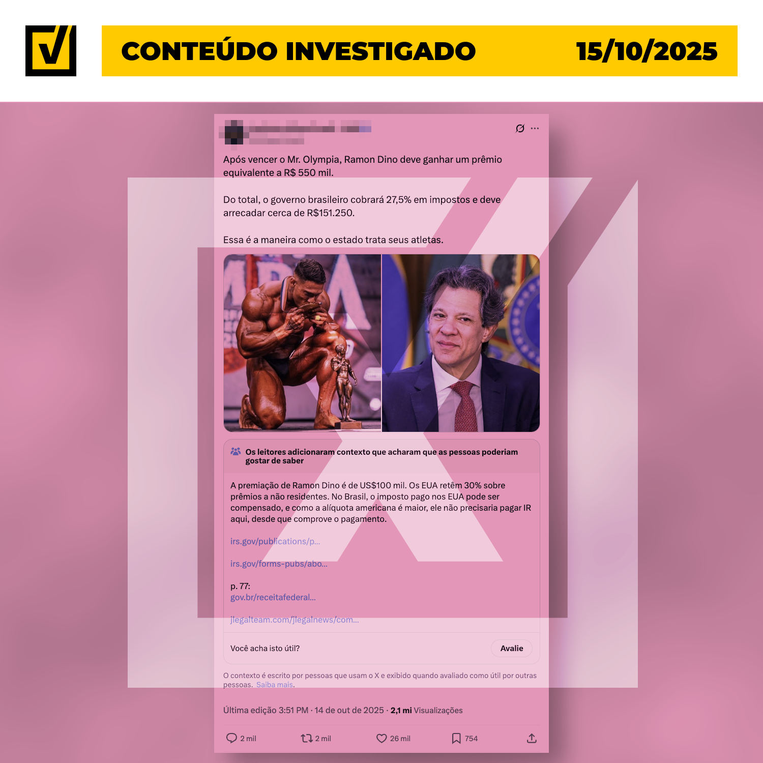 A postagem analisada mostra uma montagem com fotos de Fernando Haddad e Ramon Dino, acompanhada do texto: “Após vencer o Mr. Olympia, Ramon Dino deve ganhar um prêmio equivalente a R$ 550 mil. Do total, o governo brasileiro cobrará 27,5% de impostos. Essa é a maneira como o Estado trata seus atletas”. Ela distorce um dado verdadeiro — a existência da alíquota máxima do Imposto de Renda Pessoa Física (IRPF) — ao atribuir falsamente ao ministro a criação ou imposição dessa cobrança. A regra é antiga, prevista em lei desde 1998, e se aplica a todos os contribuintes brasileiros, sem relação com decisões recentes do governo. No entanto, o prêmio foi pago nos Estados Unidos, país que retém 30% de imposto de renda na fonte sobre valores pagos a artistas e atletas estrangeiros, conforme a Publicação 515 (2025) e o Form 1042-S do Internal Revenue Service (IRS), órgão equivalente à Receita Federal americana.