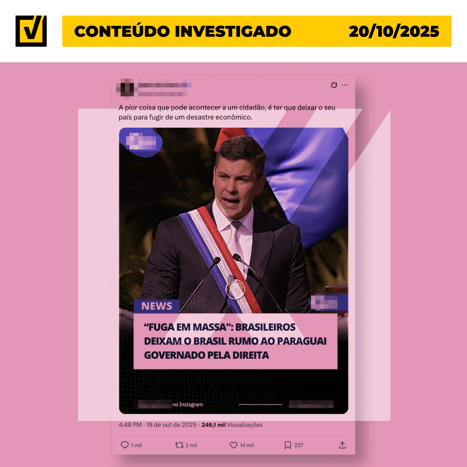 A imagem de uma página do Instagram diz: “‘Fuga em massa’: brasileiros deixam o Brasil rumo ao Paraguai governado pela direita”.