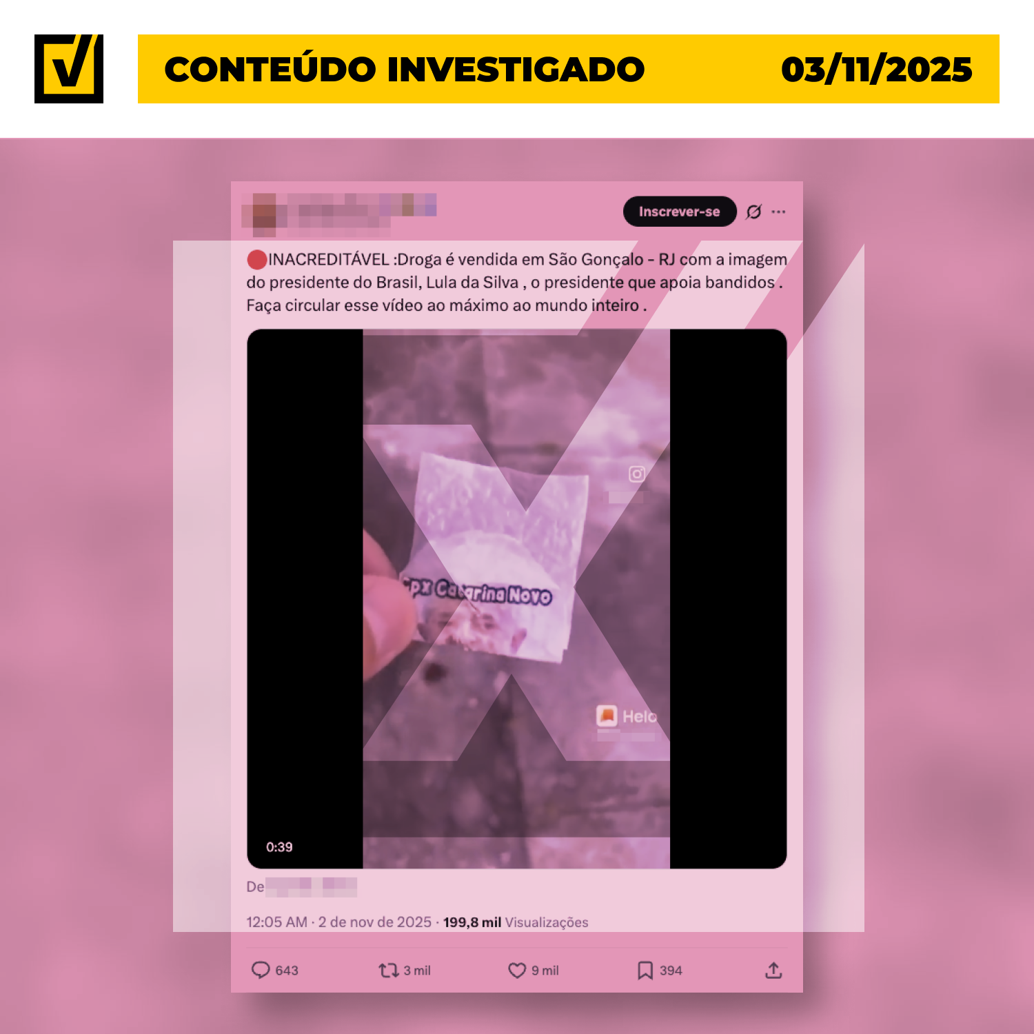 A narração do vídeo e a legenda do post tentam estabelecer uma conexão causal entre o presidente e o tráfico, com base somente na presença de sua imagem em uma suposta embalagem de droga, uma forma clássica de conteúdo enganoso, que manipula a interpretação de um elemento isolado e fora de contexto.