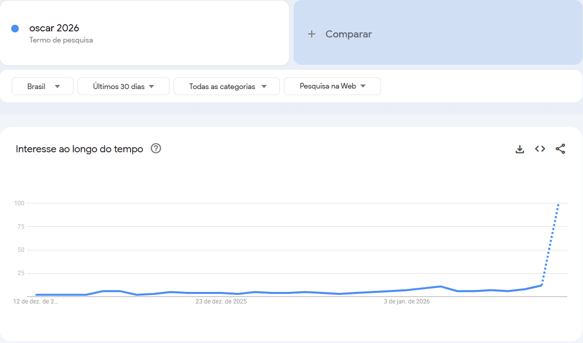 O interesse dos internautas brasileiros sobre a cerimônia gerou um aumento das pesquisas por "Oscar 2026" no Google, segundo dados do Google Trends, ferramenta que exibe os termos mais populares no buscador.