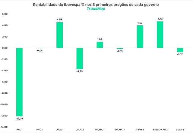 No saldo da primeira semana dos últimos presidentes, o primeiro mandato de Fernando Henrique Cardoso (PSDB), em 1994, tem o pior resultado: com uma queda de 12,09%. Já o governo de Jair Bolsonaro (PL), em 2018, tem o maior saldo positivo, com rentabilidade de 4,72%.