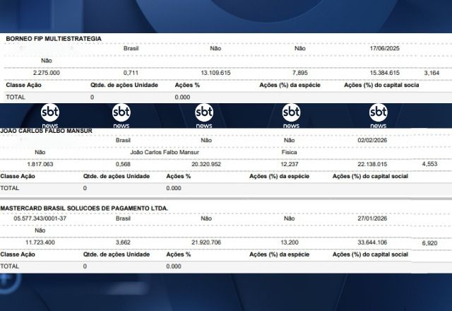 Um dos acionistas é um fundo de investimentos chamado Borneo FIP Multiestratégia. Ele é administrado pela Reag Investimentos - grupo liquidado pelo Banco Central e alvo de investigações pelas suspeitas de envolvimento com facções criminosas e o Banco Master.