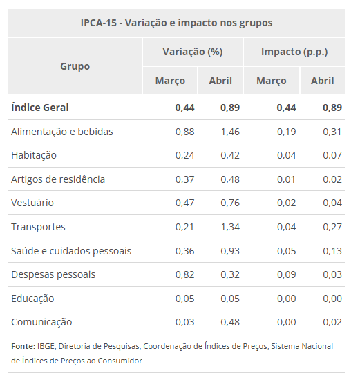 Juntos, os dois grupos respondem por 65% do IPCA-15 de abril. O bloco de Saúde e cuidados pessoais (0,93% e 0,13 ponto) vem em terceiro.