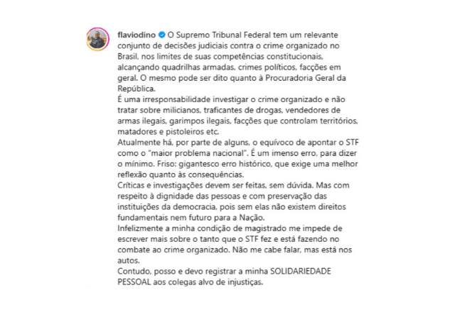 Em publicação nas redes sociais, o ministro disse que é um erro gigantesco e histórico apontar o STF como o "maior problema nacional". "É uma irresponsabilidade investigar o crime organizado e não tratar sobre milicianos, traficantes de drogas, vendedores de armas ilegais, garimpos ilegais, facções que controlam territórios, matadores e pistoleiros etc", escreveu.