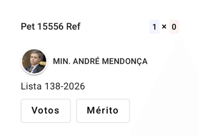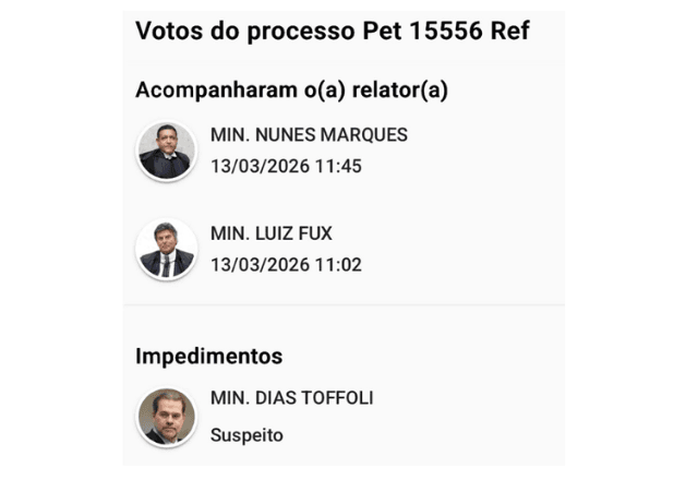 A Segunda Turma é composta, além de Mendonça e Fux, pelos ministros Gilmar Mendes, Dias Toffoli e Nunes Marques. Toffoli, porém, se declarou suspeito na quarta-feira (11) para julgar todos os casos que envolvem o Master no Supremo.