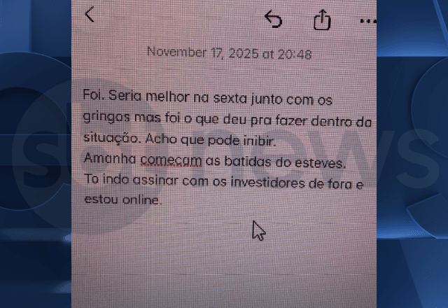 Vorcaro falou que estava "tentando antecipar os investidores": "Tenho chances de conseguir assinar e anunciar ainda hoje uma parte. E aí eu irei pra lá pra tentar assinatura dos demais investidores estrangeiros".
