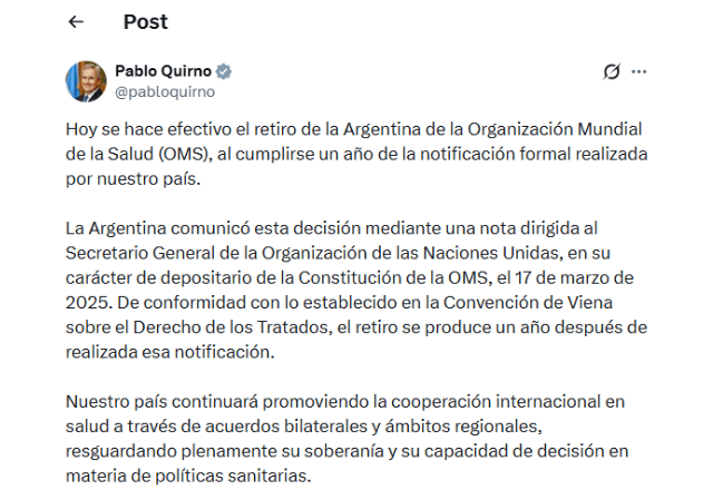 "Hoje, a saída da Argentina da Organização Mundial da Saúde (OMS) entra em vigor, um ano após a notificação formal feita pelo nosso país. A Argentina comunicou essa decisão por meio de uma nota dirigida ao Secretário-Geral das Nações Unidas, em sua qualidade de depositário da Constituição da OMS, em 17 de março de 2025. De acordo com as disposições da Convenção de Viena sobre o Direito dos Tratados, a retirada ocorre um ano após a notificação.