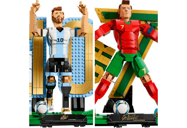 A linha também traz versões maiores de Cristiano Ronaldo e Messi, com opções de montagem em diferentes poses, como comemorações e jogadas características. No caso do argentino, há ainda um modelo em formato de quadro 3D que o retrata em sua comemoração tradicional.