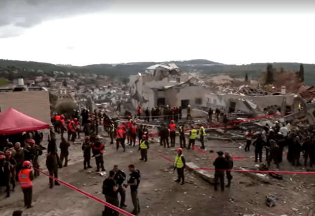Equipes de emergência israelenses trabalham no local, em meio a escombros e destroços, para resgatar vítimas presas dentro de suas casas destruídas, informou a mídia local.