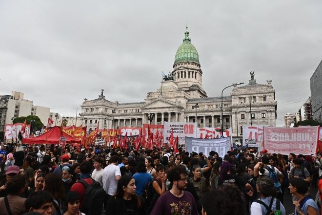 Durante a votação, centenas de manifestantes se concentraram em frente ao Congresso da Argentina, em Buenos Aires, em protesto contra a proposta. Houve confrontos com a polícia, sob forte esquema de segurança. Treze sindicatos aderiram à greve geral, considerada a de maior alcance até agora, afetando setores como transporte, bancos, administração pública, hospitais, comércio e transporte aéreo.