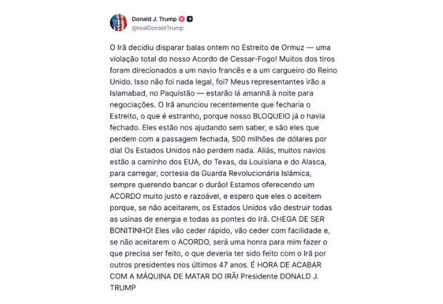 "O Irã decidiu disparar tiros ontem no Estreito de Ormuz — uma violação total do nosso acordo de cessar‑fogo! Muitos deles foram direcionados a um navio francês e a um cargueiro do Reino Unido. Isso não foi nada legal, foi?", escreveu Trump na rede social Truth Social.