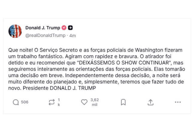 O presidente dos Estados Unidos, Donald Trump, foi retirado às pressas de um evento neste sábado (25), após um tiroteio. Em publicação nas redes sociais, Donald Trump afirmou que o Serviço Secreto e a polícia agiram “com rapidez e bravura” e disse que o atirador foi detido. Ele acrescentou que recomendou “deixar o evento continuar”, mas seguirá as orientações das autoridades.