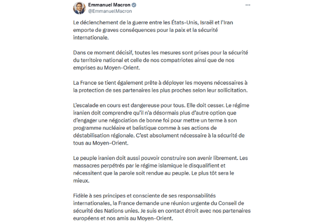 “O início de uma guerra entre os Estados Unidos, Israel e Irã tem sérias consequências para a paz e a segurança internacionais. Neste momento crucial, todas as medidas estão sendo tomadas para garantir a segurança do território nacional e de nossos compatriotas, bem como de nossos ativos no Oriente Médio. A França também está pronta para mobilizar os recursos necessários para proteger seus parceiros mais próximos, caso estes o solicitem. A escalada atual é perigosa para todos. Ela precisa parar.”