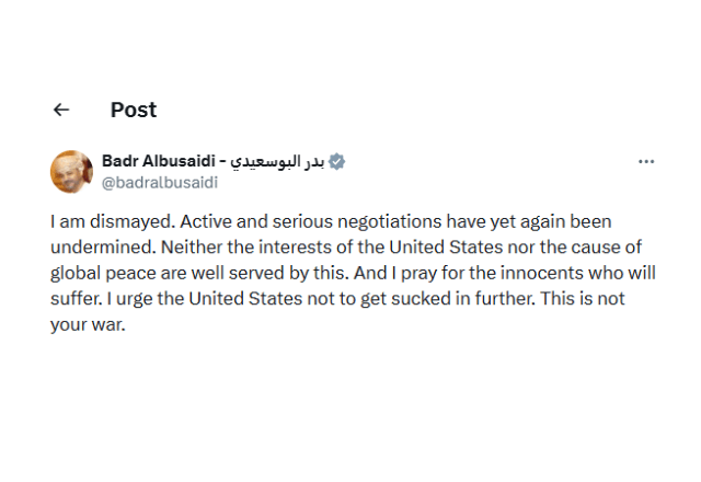 O ministro das Relações Exteriores de Omã, Badr bin Hamad Al-Busaidi, que estava mediando as conversas entre EUA e Irã nos últimos dias, se disse consternado com os ataques e criticou os Estados Unidos.