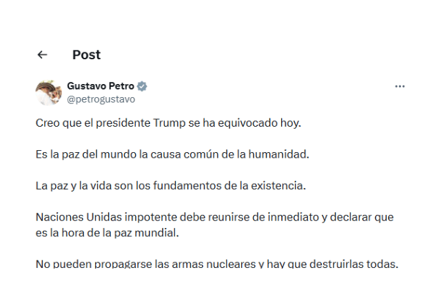 O presidente da Colômbia, Gustavo Pedro disse Trump cometeu um erro e que as Nações Unidas devem declarar que é hora de haver paz mundial.