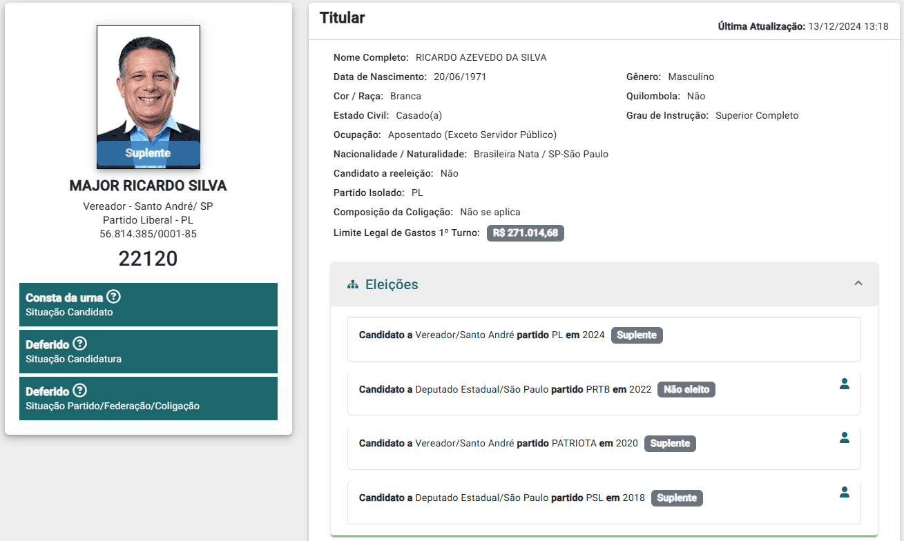 O major Ricardo Azevedo da Silva também tem atuação na política local. Ele é suplente de vereador em Santo André (SP) pelo PL e recebeu 808 votos nas últimas eleições (2024). Ele disputou outros cargos públicos ao longo dos anos: