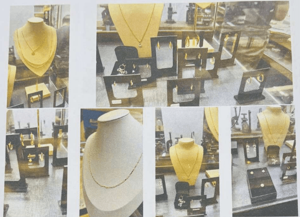Entre os itens levados estão alianças de prata e solitários, com peso total de 327 gramas, avaliadas em R$ 18 mil, além de 165 alianças em aço inox, estimadas em R$ 16,5 mil. Também foi furtado ouro destinado à fabricação de joias, cujo valor chega a R$ 39.840. As peças expostas na vitrine, principalmente em ouro 18 quilates, representam a maior parte do prejuízo. Segundo o documento, esses itens somam 149 gramas e foram avaliados em R$ 178,8 mil. O material inclui colares, pingentes, brincos e conjuntos completos.