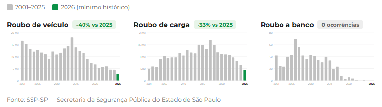 O Estado de São Paulo registrou, no primeiro bimestre de 2026, o menor número de roubo de veículos, carga e banco da série histórica, ou seja, 2001, segundo dados da Secretaria da Segurança Pública de São Paulo (SSP).