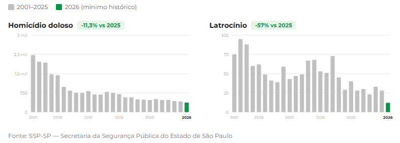 Na Grande São Paulo, os roubos atingiram o menor nível em mais de duas décadas, e os latrocínios foram zerados em fevereiro. Já no interior, os roubos de carga caíram 44%, atingindo o menor patamar desde 2001, enquanto roubos e furtos de veículos também registraram níveis historicamente baixos.