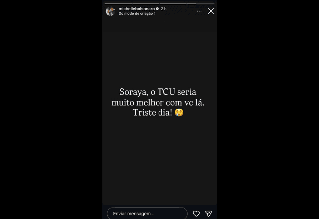 Logo depois do anúncio nesta terça-feira (14) de que a deputada do PL não concorreria mais, Michelle fez uma postagem em seu Instagram com a frase “Soraya, o TCU seria muito melhor com vc lá. Triste dia!”.