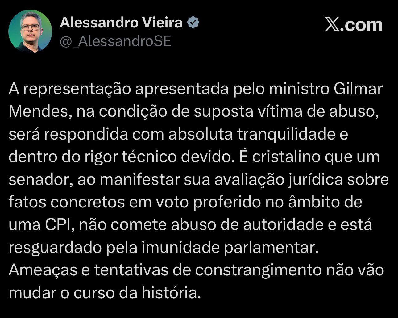Mais tarde, o senador se pronunciou publicamente via redes social X, afirmando que a representação de Gilmar Mendes será respondida "com absoluta tranquilidade e rigor técnico devido".