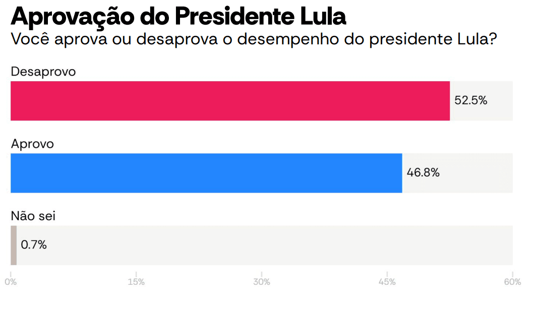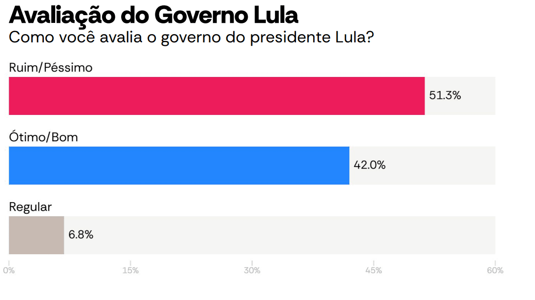 O levantamento Atlas/Bloomberg traz índices que medem desempenho do governo Lula junto a eleitores. A desaprovação saiu de 54% em março para 52,5% em abril. A aprovação subiu de 46% no mês passado para os 46,8% atuais.