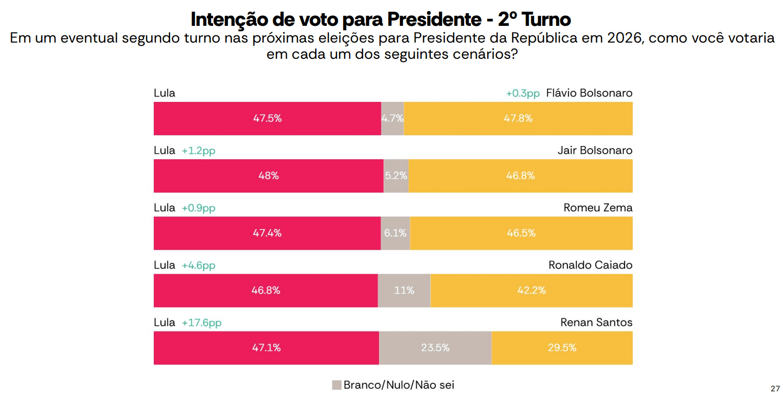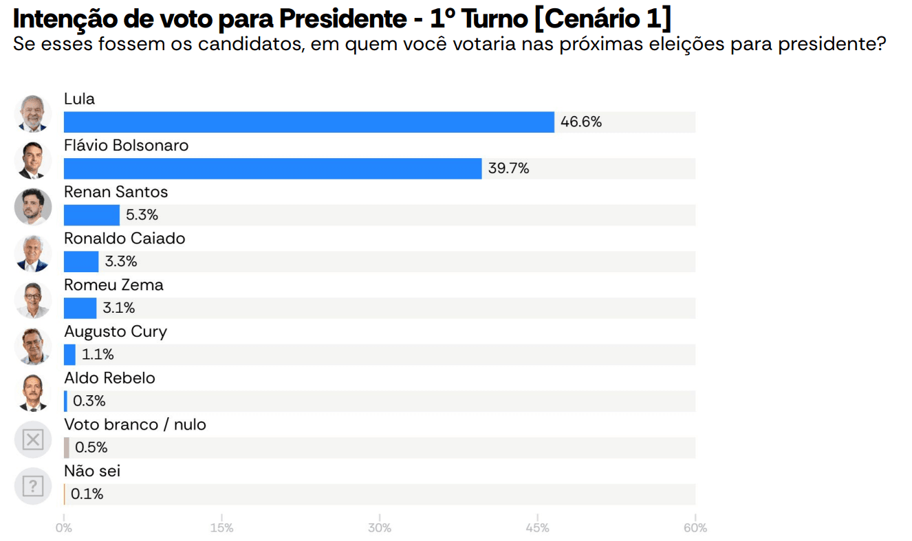 A pesquisa montou três simulações de primeiro turno para presidente. Em quadro com sete candidatos, Lula lidera com 46,6%, seguido de Flávio Bolsonaro, que marca 39,7%. Depois, aparecem Santos (5,3%), Caiado (3,3%), Zema (3,1%), Augusto Cury (Avante), que soma 1,1%, e Aldo Rebelo (DC), com 0,3%.