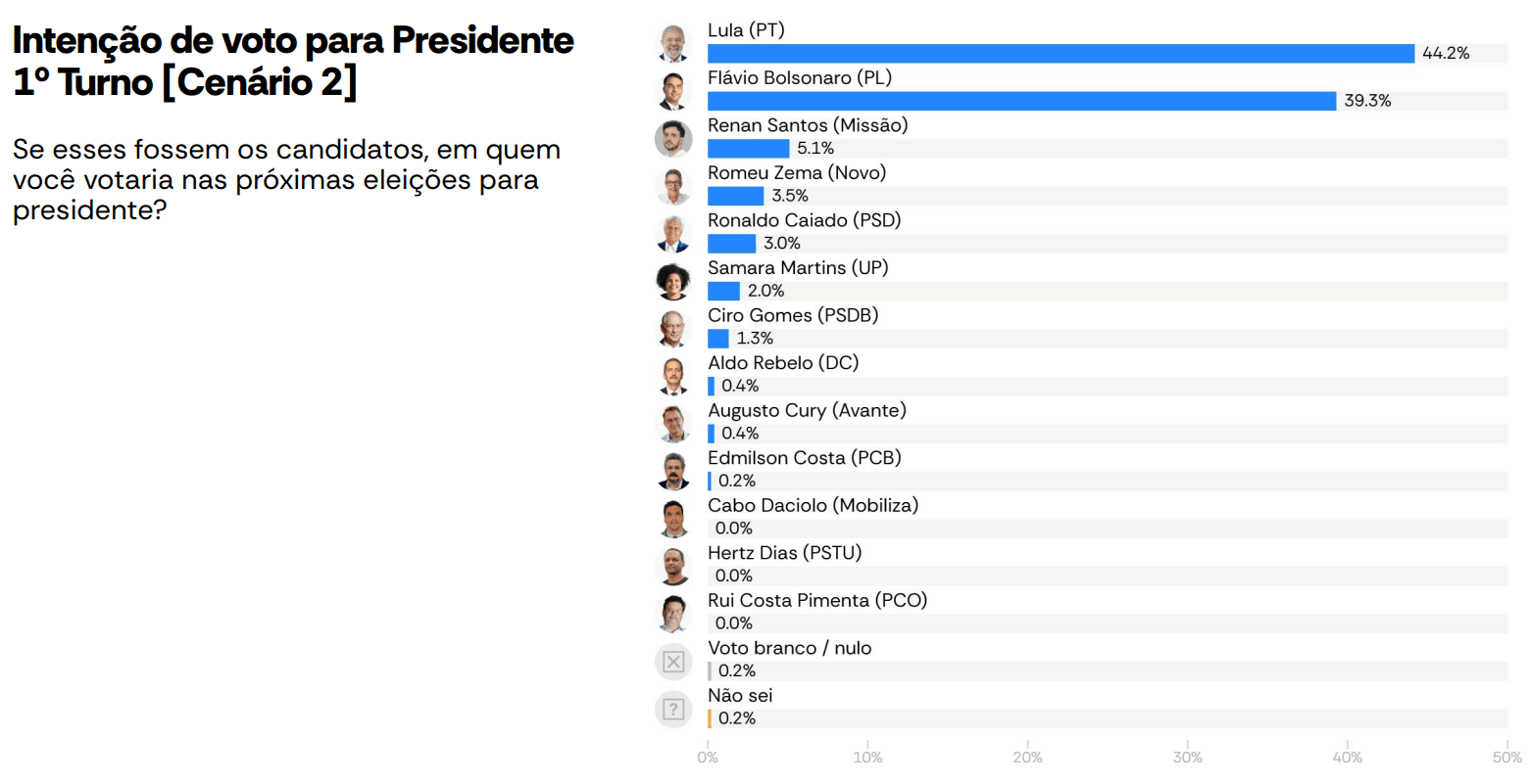 O petista venceria Ronaldo Caiado (PSD) e Renan Santos (Missão) acima da margem de erro: 46,8% a 42,2% do ex-governador de Goiás e 47,1% a 29,5% de um dos fundadores do Movimento Brasil Livre (MBL).
