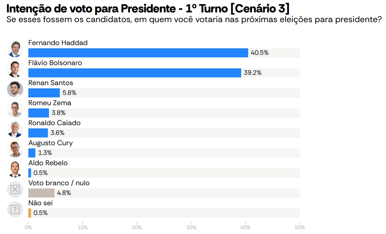 O terceiro eventual primeiro turno coloca Haddad no lugar de Lula. O ex-ministro da Fazenda soma 40,5% contra 39,2% de Flávio Bolsonaro. Completam a lista Santos (5,8%), Zema (3,8%), Caiado (3,6%), Cury (1,3%) e Rebelo (0,5%). Votos em branco ou nulo atingem 4,8%.