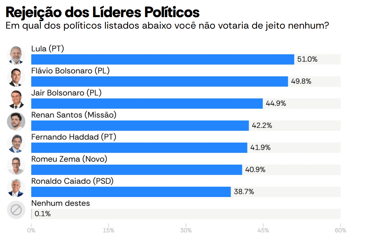 A pesquisa também reúne números de rejeição de sete nomes da política. Lula lidera com 51%, seguido de perto por Flávio Bolsonaro, que atinge 49,8%. Jair Bolsonaro marca 44,9%. Depois, aparecem Santos (42,2%), Haddad (41,9%), Zema (40,9%) e Caiado (38,7%).