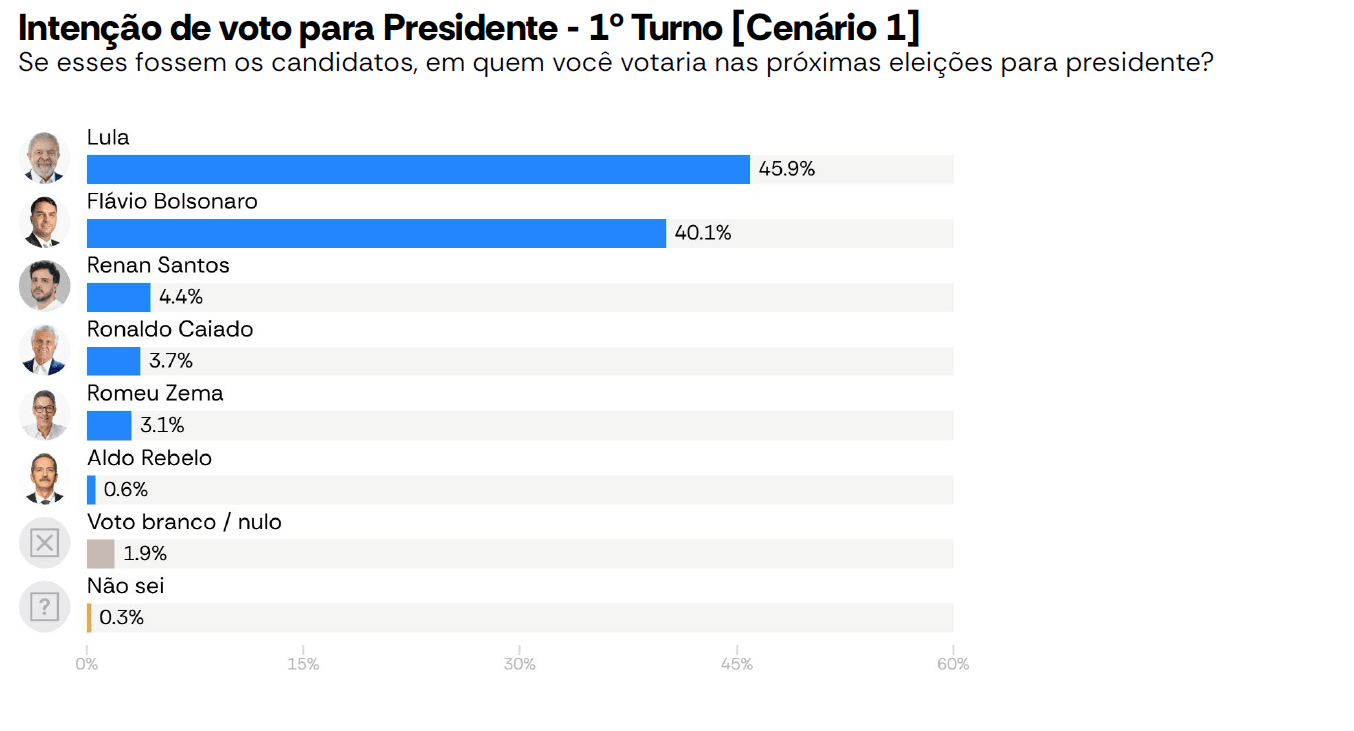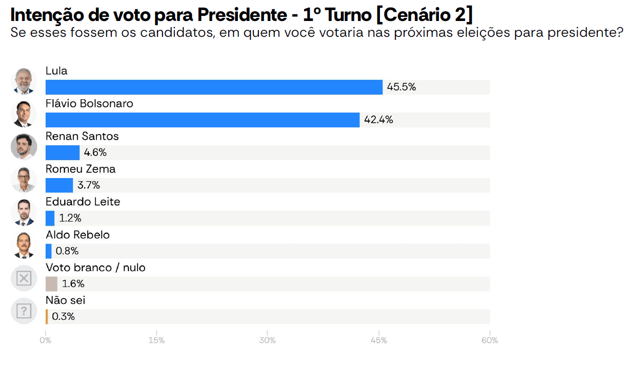 O senador Flávio Bolsonaro (PL-RJ) tem 47,6% das intenções de voto contra 46,6% do presidente Lula (PT) em cenário de segundo turno testado pelo AtlasIntel/Bloomberg, que divulgou nova pesquisa de eleições presidenciais nesta quarta-feira (25).