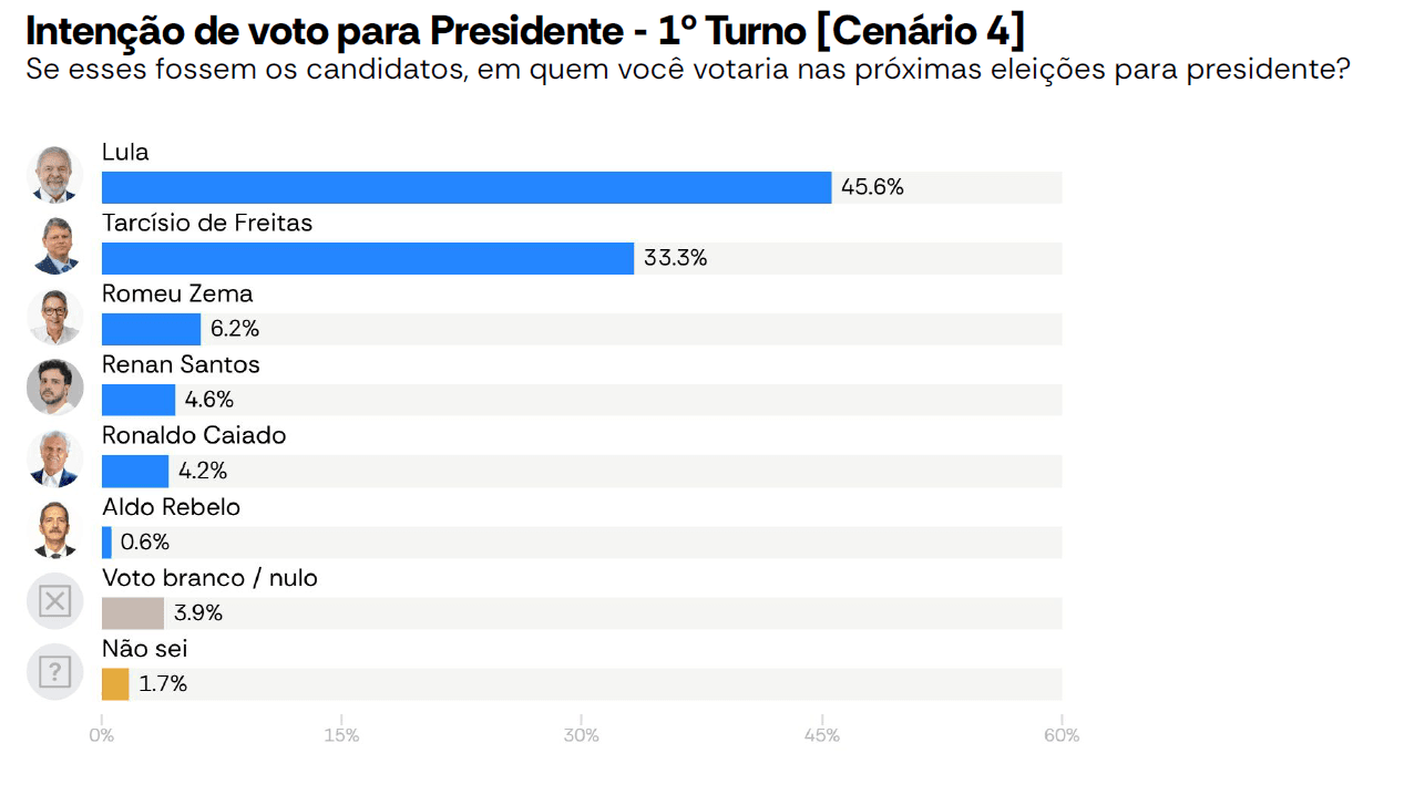Em outro eventual segundo turno, o governador de São Paulo, Tarcísio de Freitas (Republicanos), aparece com 47,2% contra 46,3% de Lula. O mandatário de SP deve concorrer à reeleição no estado.
